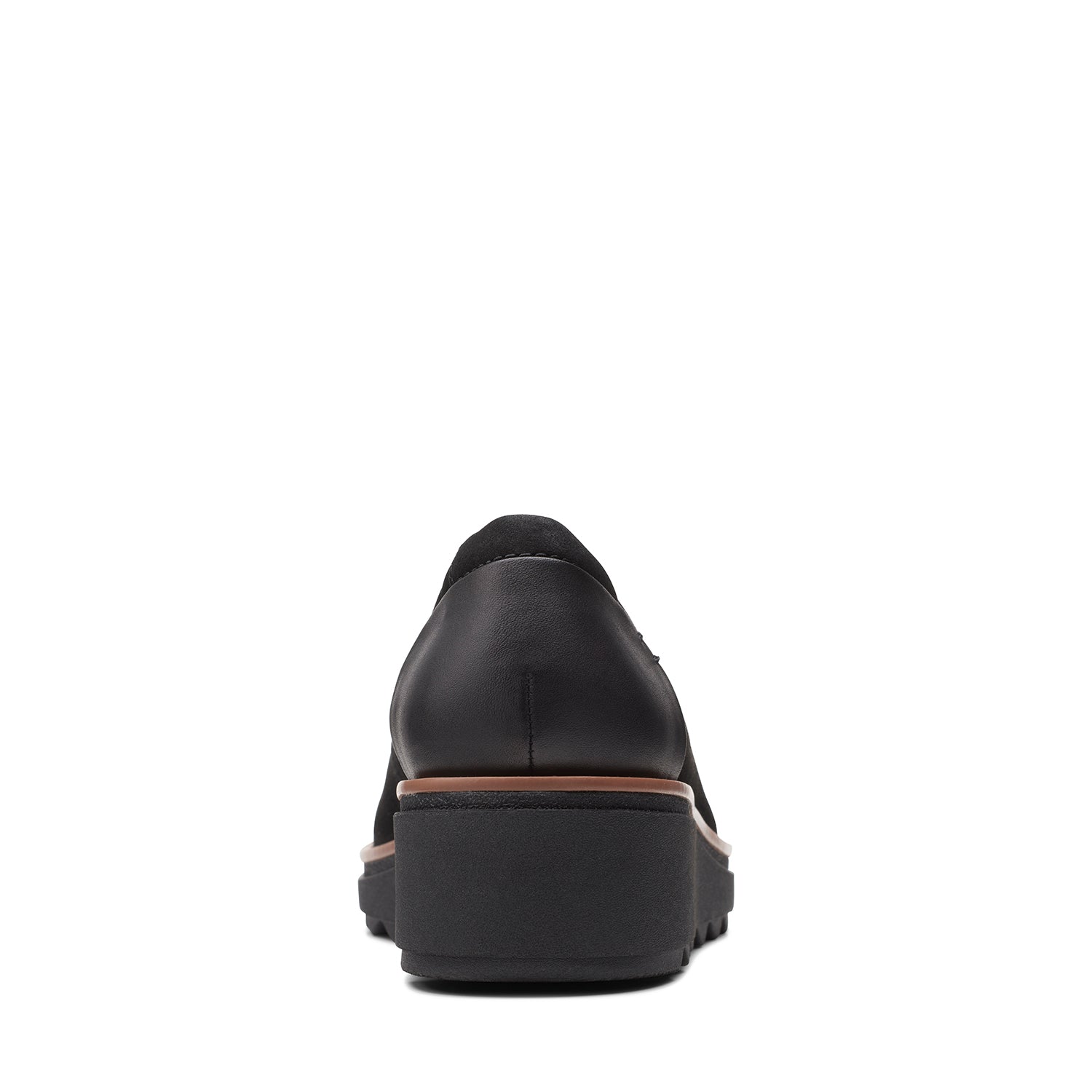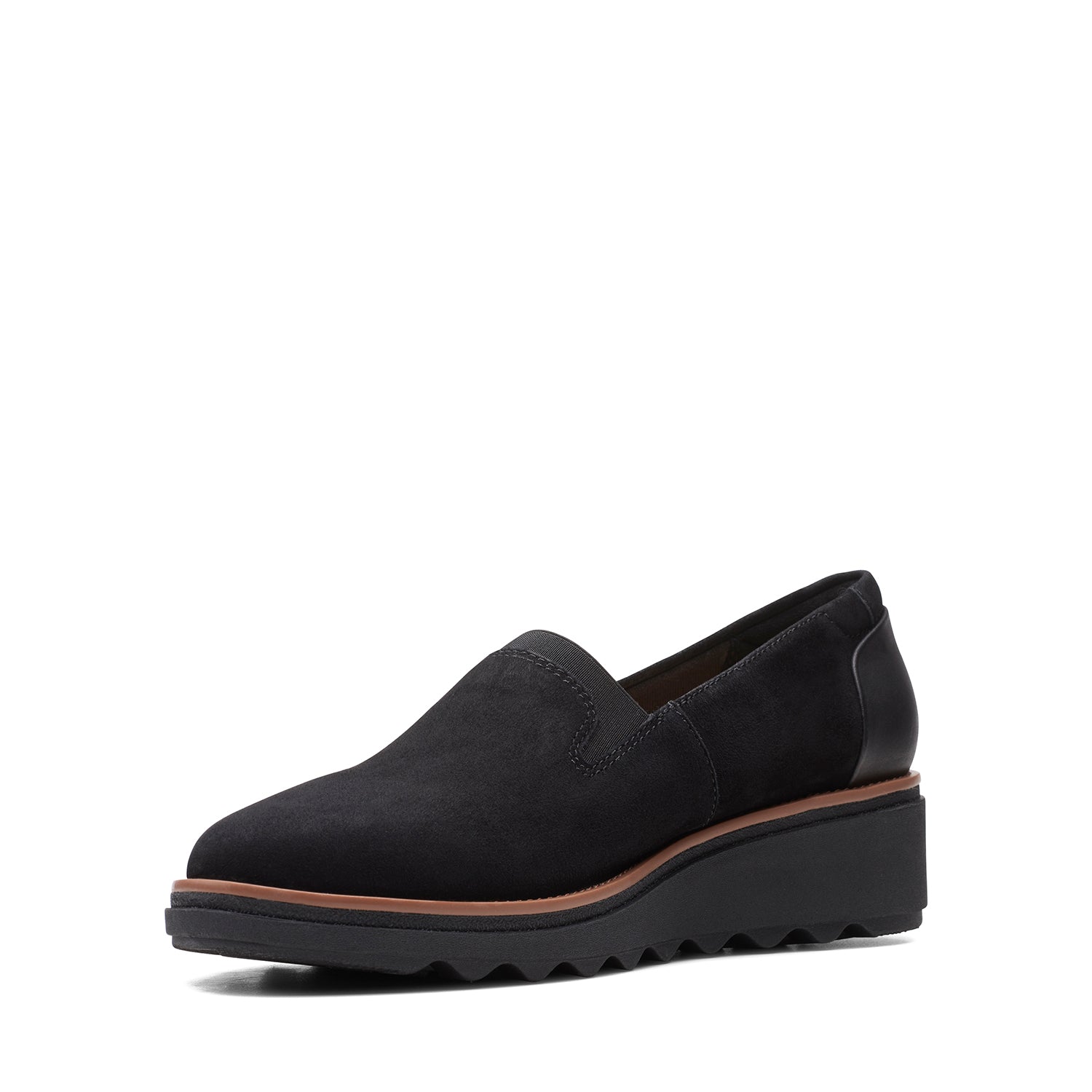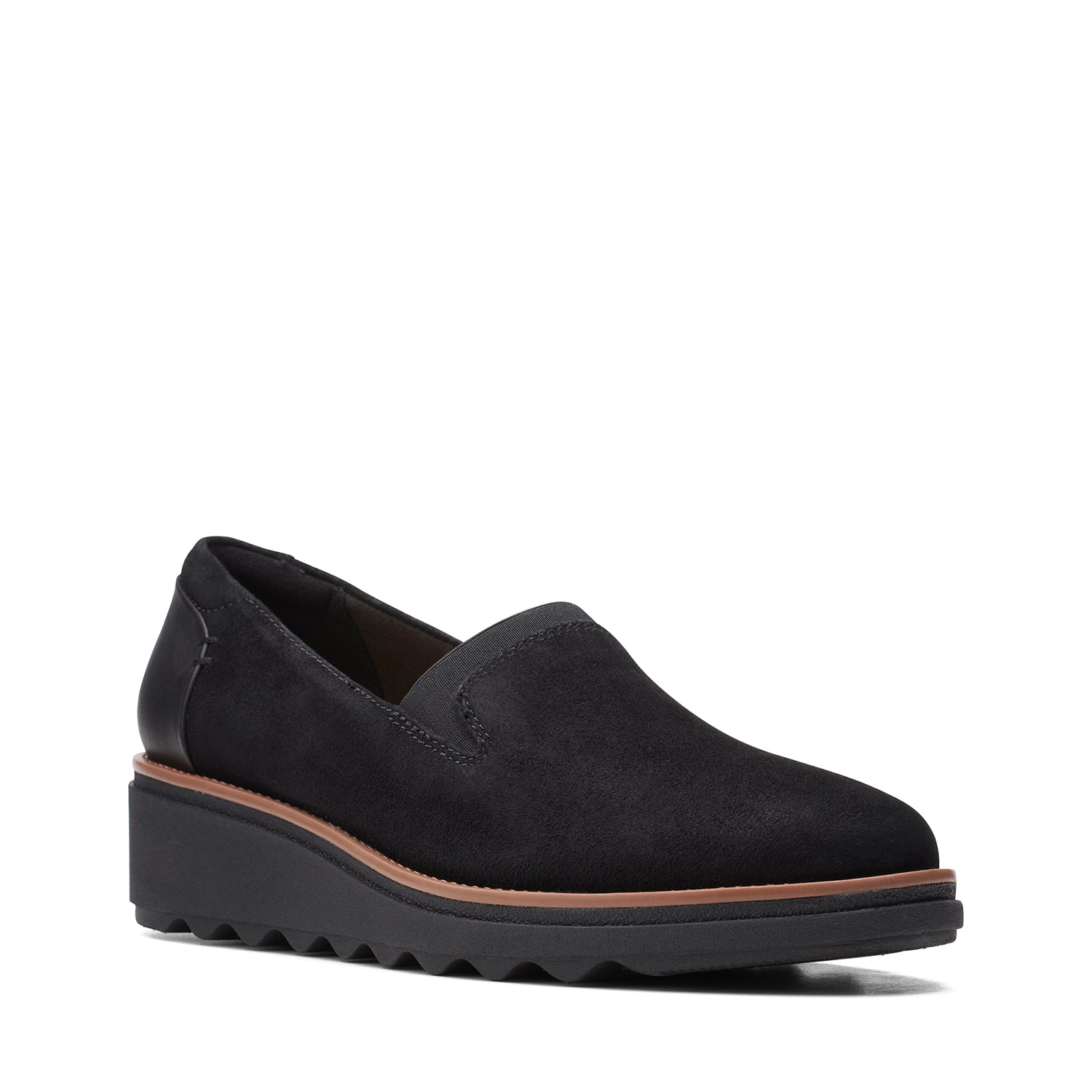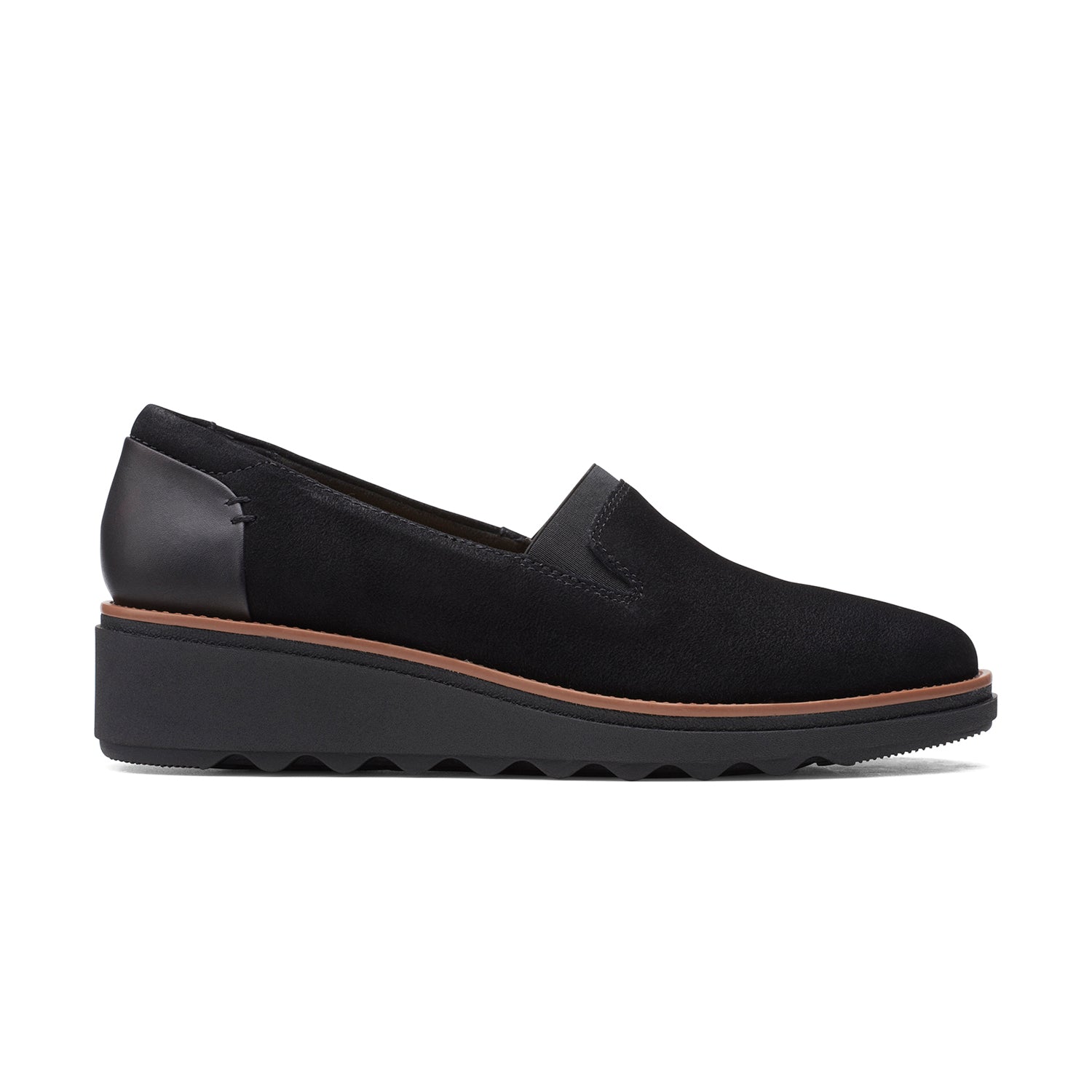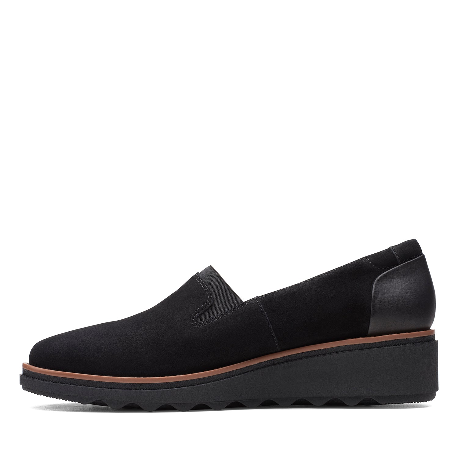With a 4.5cm wedge heel, casual slip-on Sharon Dolly in soft black suede boasts crafted stitch work. Its elasticated panel eases foot entry and the lightweight, flexible sole offers plenty of reassuring grip. And comfort's guaranteed too, thanks to Cushion Soft™ padding that ensures long-lasting support.- Premium black suede upper
